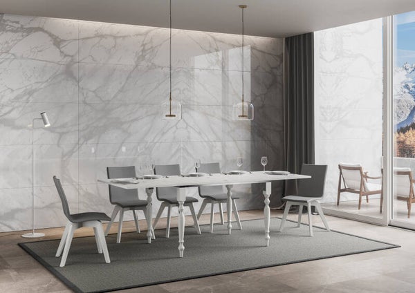 Il piano rettangolare da 120×90 centimetri è composto da due piani. Facendolo scorrere sulle apposite guide, aprendolo a libro, in pochi secondi può essere trasformato in un tavolo rettangolare da 240×90 cm raddoppiando l’area di utilizzo.