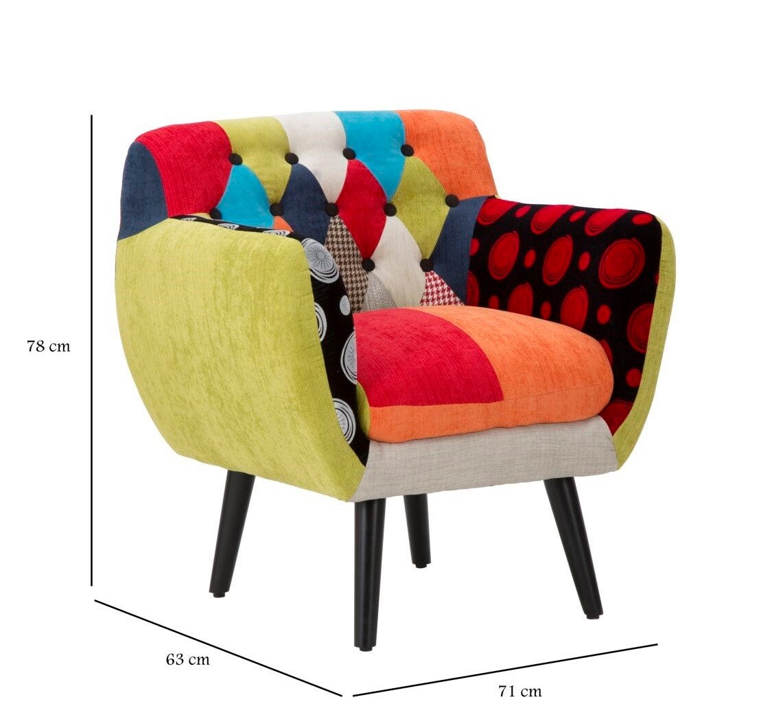 Porta un tocco di personalità nella tua casa con questa elegante poltrona patchwork multicolor, un complemento d’arredo che unisce comfort, vivacità e design contemporaneo. Ogni pannello di tessuto è selezionato per creare un gioco di colori e fantasie che rende la poltrona un pezzo unico, perfetto per ravvivare soggiorno, camera da letto, studio o un angolo relax.