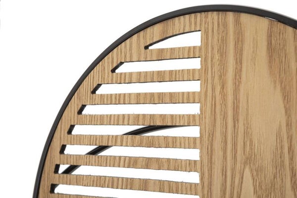 L'interplay tra la struttura in ferro nero e le sfumature di legno rovere conferisce un contrasto visivo coinvolgente, mentre le diverse dimensioni delle figure circolari aggiungono profondità e interesse visivo all'opera.