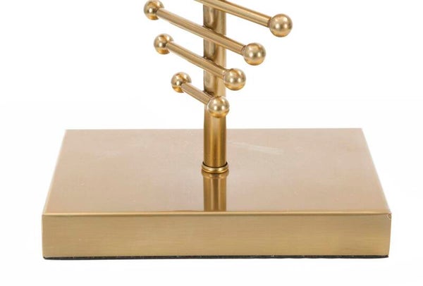 Lampada da tavolo con uno stelo in metallo dorato, configurato in una sequenza geometrica di linee e sfere che ricorda una moderna interpretazione di un albero della vita. Il contrasto visivo tra la struttura dorata e il paralume nero crea un equilibrio perfetto tra calore e contemporaneità.