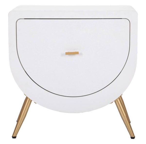 Questo comodino elegante, con il suo design semicircolare e una finitura bianca opaca, è il complemento perfetto per ambienti ricercati come hotel, B&B e strutture ricettive. Le sue forme arrotondate e pulite donano un'estetica raffinata e moderna, mentre i dettagli dorati, come i pomelli e le gambe sottili, aggiungono un tocco di lusso discreto.