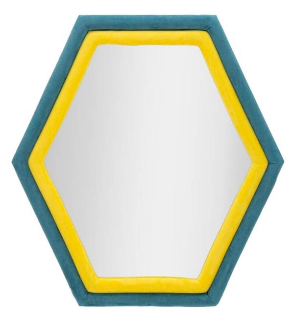 Specchiera esagonale da muro SIX in velluto blu e giallo