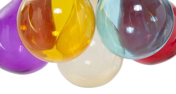 Le ampie lampade in vetro colorato – rosso, azzurro, giallo, viola e bianco – creano un gioco di luci vivace e dinamico, ideale per aggiungere un tocco di personalità a qualsiasi ambiente.
