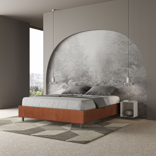 Rivestito in tessuto fantasia geometrica color mattone, unisce stile e funzionalità, diventando il protagonista ideale di ambienti moderni e sofisticati. La lavorazione tessile effetto "labirinto" conferisce al letto un look distintivo e originale, perfetto per chi ama osare con eleganza.