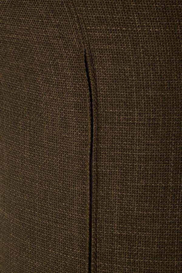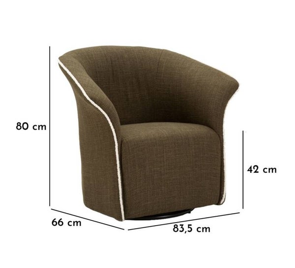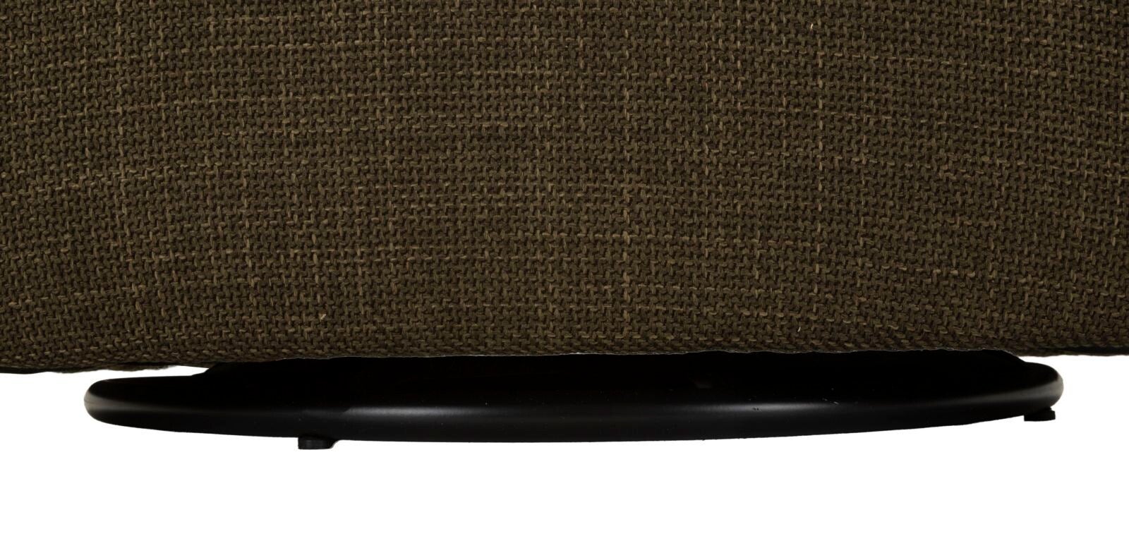 Il rivestimento in tessuto strutturato verde oliva dona carattere ed eleganza, perfetto per ambienti moderni, nordici o naturali. Il dettaglio del profilo in bouclé bianco, applicato lungo tutto il bordo, aggiunge un contrasto raffinato e valorizza le linee curve del design.